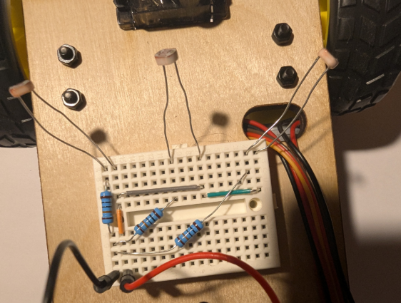- Add 2 resistors and photoresistors pair, wiring to A1 and A2. Ensure you have spaced them out and